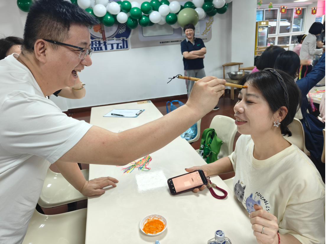除了包粽子外,還組織了縫香包、編蛋袋、撞蛋、點(diǎn)額等形式多樣的活動(dòng)。其中點(diǎn)額儀式則是端午節(jié)活動(dòng)中的一項(xiàng)重要儀式?,F(xiàn)場(chǎng)擺放著雄黃酒和艾草制品,大家將雄黃酒點(diǎn)在額頭、耳后、手腕等處,雄黃酒香氣四溢、艾草清香撲鼻,構(gòu)成了端午獨(dú)特的氣息,這不僅是對(duì)傳統(tǒng)文化的尊重與傳承,更是讓我們?cè)诂F(xiàn)代生活中仍感受到那份來(lái)自古代的智慧與關(guān)懷。